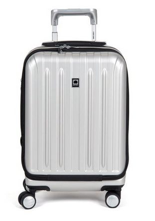 Designed for frequent travel, this carry-on suitcase features spinner wheels and measures 11.25 inches long, 14.5 inches wide, and 21.25 inches tall overall