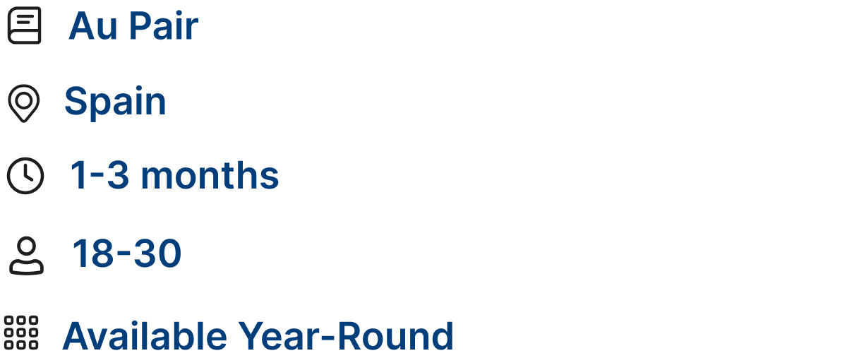 You'll live with a host family and help with childcare and light household duties while experiencing daily Spanish life. Expect a mix of school runs, playtime, meals, and becoming part of the family rhythm—plus plenty of time to explore.